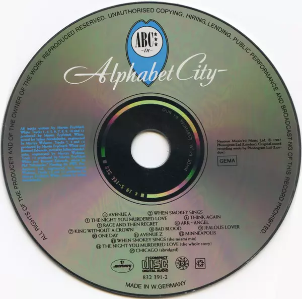 ABC: Alphabet City A lemezen lévő változat CD - standard kiadás. Ez a különleges kiadás - Európa a kiadó által Mercury a következőkkel együttműködve Phonogram és Neutron Records napján jelent meg 1987. Album műfajok között Pop, Elektronikus zene és Synth-Pop.