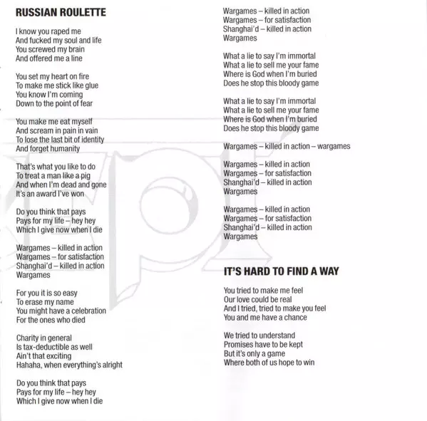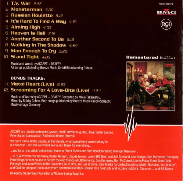 Sedmá LP deska Accept "Russian Roulette" se dostala do uší fanoušků v roce 1986 a okamžitě se v nich pevně usadila. Se skladbami "Heaven Is Hell", "Walking In The Shadows", "TV War" a "Monsterman" přinesla pětice ze Solingenu obvyklé pitoreskní zboží IG Schwermetall - vřele doporučované album pro fanoušky bezdechu!