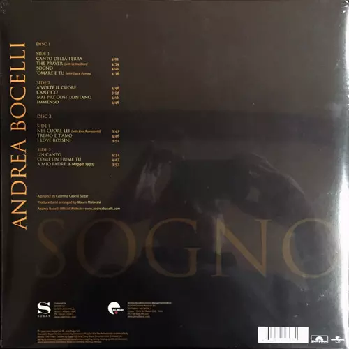 Andrea Bocelli's Sogno ("Dream") is a pop album featuring original compositions. Among the 14 tracks on the album are "The Prayer", a duet with Celine Dion, "Come un Fiume Tu", a collaboration with Ennio Morricone, "O Mare e Tu", a duet with Dulce Pontes, and many other classics from Bocelli's repertoire.