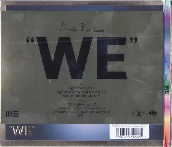 "WE", očekávané šesté studiové album skupiny Arcade Fire, vyjde u Columbia Records. Album "WE", které produkovali Nigel Godrich, Win a Régine a které se nahrávalo na různých místech včetně New Orleans, El Pasa a Mount Desert Island, paradoxně destiluje "nejdelší dobu, kterou jsme kdy strávili psaním bez přerušení, pravděpodobně vůbec kdy" (Win ...