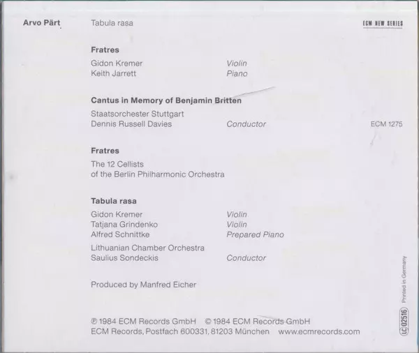 Arvo Pärt A: Tabula Rasa is an album of classical music composed by Arvo Pärt in 1984. The album consists of six tracks, all based on a single theme. The pieces are performed by the Estonian Philharmonic Chamber Choir and the Tallinn Chamber Orchestra under the direction of Tonu Kaljuste. The album was released in 1985 on the ECM label.