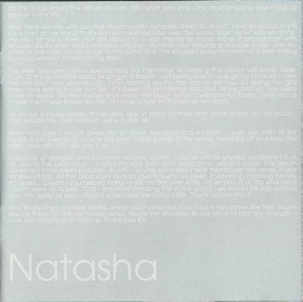 Atomic Kitten: Feels So Good A lemezen lévő változat CD - standard kiadás. Ez a különleges kiadás - Európa a kiadó által Innocent a következőkkel együttműködve Virgin napján jelent meg 2002. Album műfajok között Pop, Elektronikus zene, Ballada, Dance-pop, Disco és Europop.