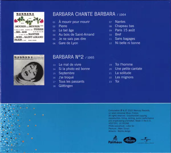 Barbara: Barbara (Intégrale De La Discographie Officielle Studio Et Live) DLX | LTD | NUM A lemezen lévő változat 29CD/Dobozkészlet - deluxe korlátozott példányszámban egyenként számozott felújított kiadás. Ez a különleges kiadás - Franciaország a kiadó által Label Panthéon a következőkkel együttműködve Mercury és Universal Music France év 9. december 2022. Album műfajok között Pop és Chanson. Numbered Deluxe Limited Edition.