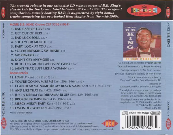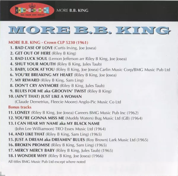 This album is a compilation of recordings from 1961 and showcases King's blues talent. All tracks are originals and feature King's signature guitar playing and soulful vocals. The album is a must-listen for all blues fans and a great introduction to King's music for newcomers.