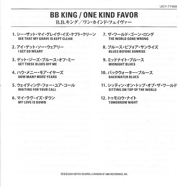 B.B. King: One Kind Favor LTD A lemezen lévő változat CD - korlátozott példányszámban felújított kiadás. Ez a különleges kiadás - Japán a kiadó által Geffen Records év 25. szeptember 2015. Album műfajok között Blues és Electric Blues.
