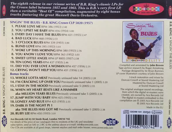 B.B. King: Singin' The Blues A lemezen lévő változat CD - felújított kiadás. Ez a különleges kiadás - UK a kiadó által Ace év 19. április 2005.