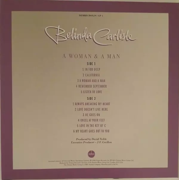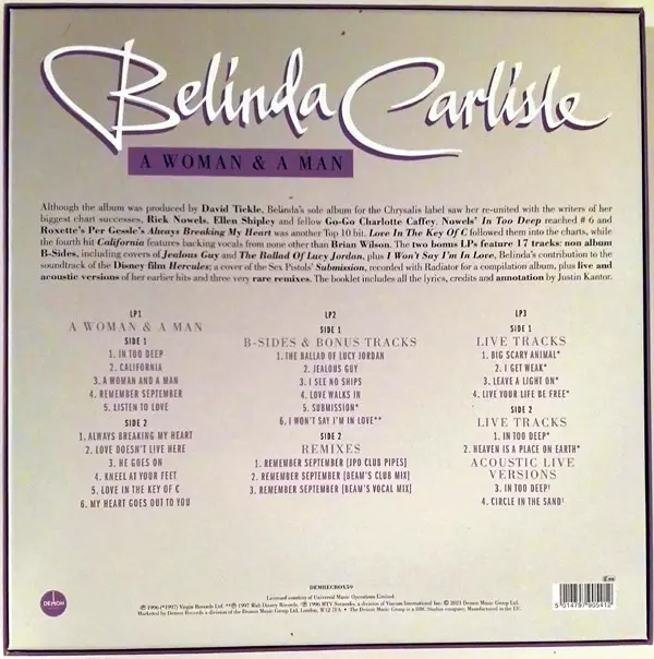 Belinda Carlisle: A Woman & A Man DLX | LTD A lemezen lévő változat bakelitlemez 3LP/Dobozkészlet - deluxe korlátozott példányszámban kiadás. Ez a különleges kiadás - Európa a kiadó által Demon Records év 10. szeptember 2021. Album műfajok között Rock, Pop, Ének, Ballada és Pop Rock. 180g 25th Anniversary Limited Deluxe Edition.