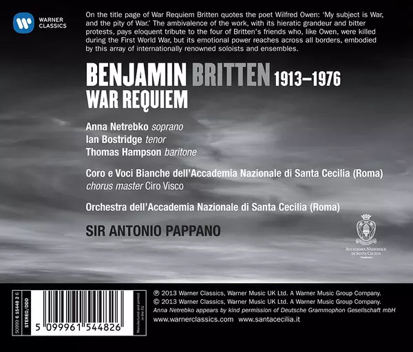 | Művész | Orchestra dell'Accademia Nazionale di Santa Cecilia | Coro dell'Accademia Nazionale di Santa Cecilia | Antonio Pappano | Benjamin Britten | Anna Netrebko | Thomas Hampson | Ian Bostridge |