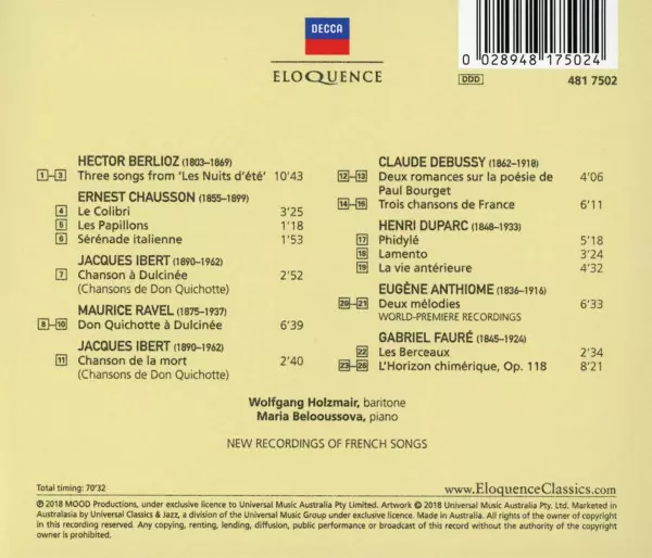 | Művész | Maurice Ravel | Claude Debussy | Hector Berlioz | Gabriel Fauré | Ernest Chausson | Jacques Ibert | Wolfgang Holzmair | Henri Duparc | Maria Belooussova | Eugène Anthiome |