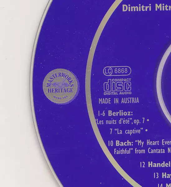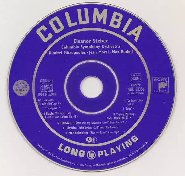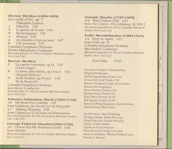 | Művész | Johann Sebastian Bach | Georg Friedrich Händel | Joseph Haydn | Felix Mendelssohn-Bartholdy | Hector Berlioz | Columbia Symphony Orchestra | Dimitri Mitropoulos | Jean Morel | Eleanor Steber | Max Rudolf |