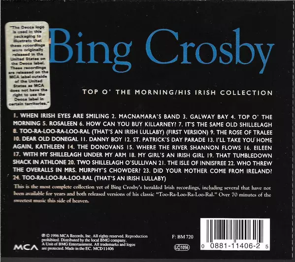 Bing Crosby: Top O' The Morning / His Irish Collection A lemezen lévő változat CD - standard kiadás. Ez a különleges kiadás - Európa a kiadó által MCA Records év 27. február 1996. Album műfajok között Pop és Ének.