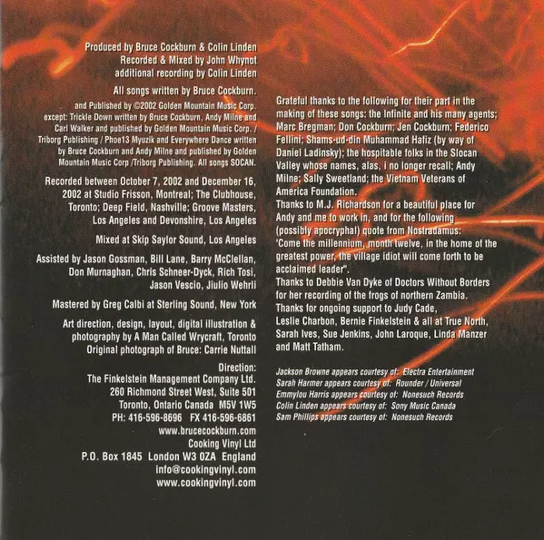 Bass John Dymond (2) | Drums Ben Riley (3), Gary Craig | Harmony Vocals Emmylou Harris | Violin, Loops Hugh Marsh | Vocals, Twelve-String Guitar [12-String Guitar] Bruce Cockburn