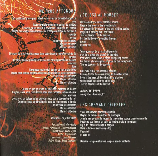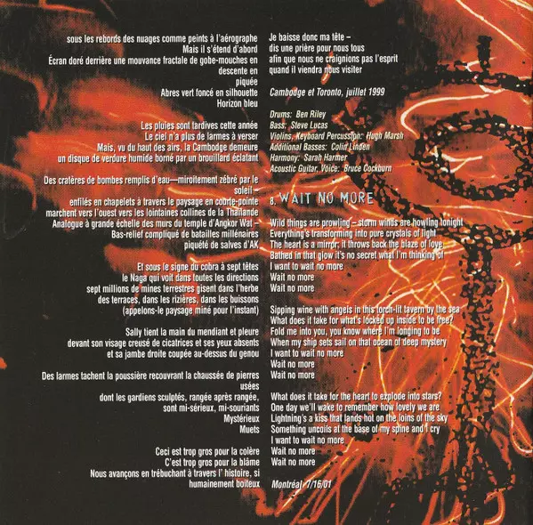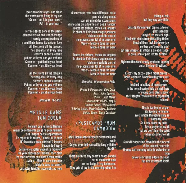 Electric Upright Bass Larry Taylor | Marimba Stephen Hodges | Percussion Gary Craig | Violin Hugh Marsh | Vocals, Acoustic Guitar Bruce Cockburn