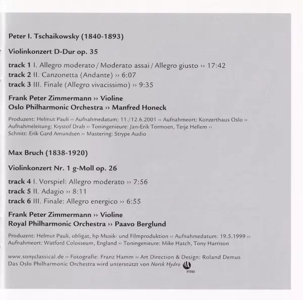 | Művész | Pyotr Ilyich Tchaikovsky | Max Bruch | Frank Peter Zimmermann |