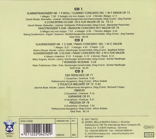 | Cím | Klavierkonzerte • Fagottkonzert • Klarinettenkonzert Nr. 1 = Piano Concertos • Bassoon Concerto • Clarinet Concerto No. 1 |