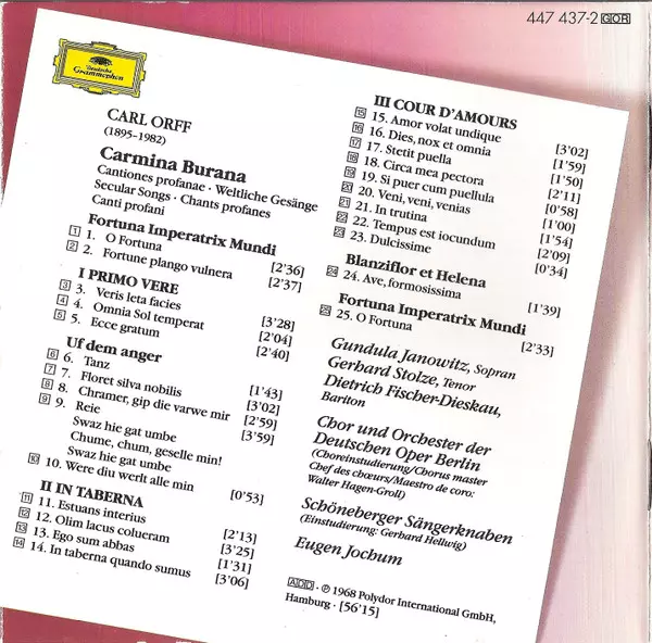 | Művész | Carl Orff | Dietrich Fischer-Dieskau | Eugen Jochum | Gundula Janowitz | Chor Der Deutschen Oper Berlin | Gerhard Stolze | Orchester Der Deutschen Oper Berlin |