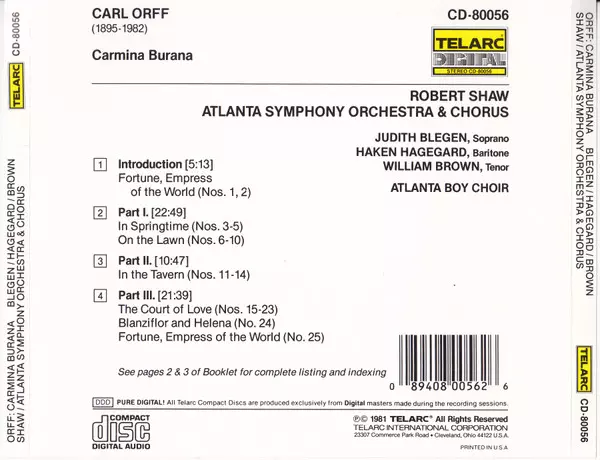 | Művész | Carl Orff | Robert Shaw | Atlanta Symphony Orchestra | Atlanta Symphony Chorus | Håkan Hagegård | Judith Blegen | The Atlanta Boy Choir | William Brown |