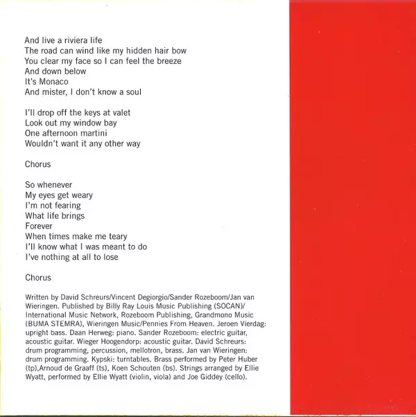 Arranged By [Strings], Violin, Viola Ellie Wyatt | Backing Vocals Alina Sleebe | Drum Programming, Drums, Vibraphone, Percussion David Schreurs | Electric Bass, Electric Guitar Sander Rozeboom | Organ [Hammond B3] Robin Veldman | Percussion [Additional], Backing Vocals Wieger Hoogendorp | Written-By David Schreurs, Sander Rozeboom, Vincent Degiorgio