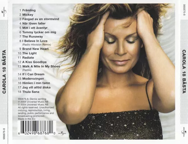 Carola: 18 Bästa A lemezen lévő változat CD - standard kiadás. Ez a különleges kiadás - Skandinávia a kiadó által Universal év 17. november 2004. Album műfajok között Pop, Elektronikus zene, Sláger és Synth-Pop.