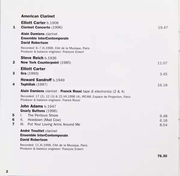 | Művész | Steve Reich | John Adams | Ensemble Intercontemporain | Elliott Carter | David Robertson | Howard Sandroff | Alain Damiens | André Trouttet |