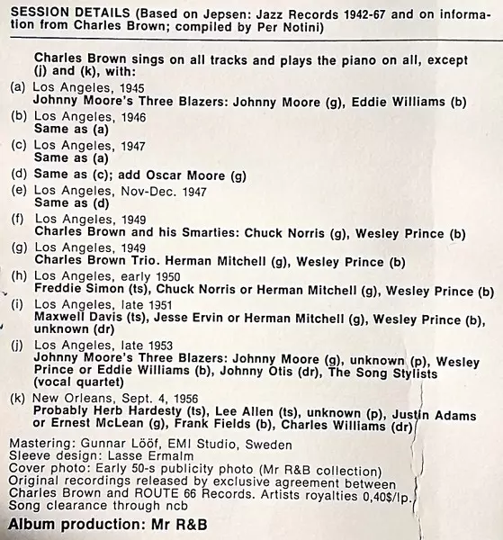 | A6 | Charles Brown, Johnny Moore's Three Blazers: Free Lancin' Again | 2:29 min | |