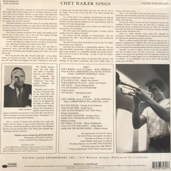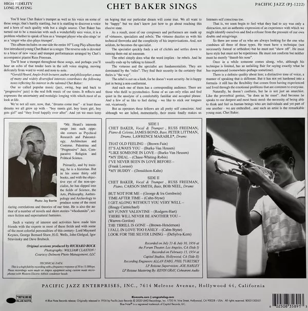 There are several albums titled Chet Baker Sings, but this Pacific Jazz recording is the original, and arguably, the best. Highlights Chet's indelible vocals and sterling trumpet playing with two quartet line-ups on a set of classic standards. For the first time in 60 years, this definitive edition is pristinely cut from the original masters. Includes additional session photography. Blue Note Records' Tone Poet Audiophile Vinyl Reissue Series features 180g vinyl in deluxe gatefold packaging.