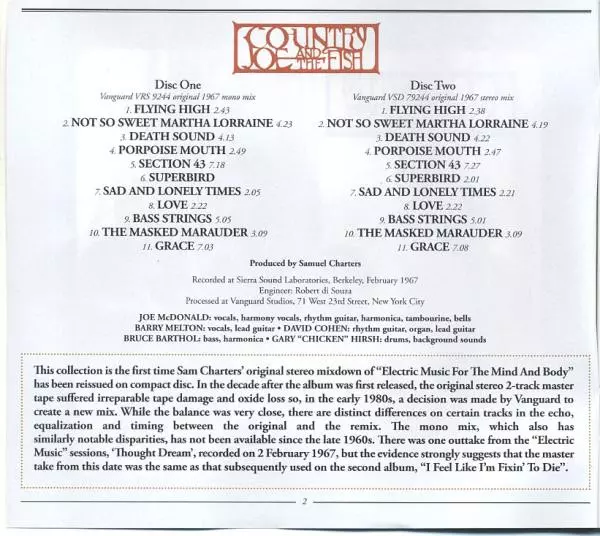 Country Joe And The Fish: Electric Music For The Mind And Body A lemezen lévő változat 2CD - standard kiadás. Ez a különleges kiadás - UK a kiadó által Ace a következőkkel együttműködve Vanguard év 15. április 2013.