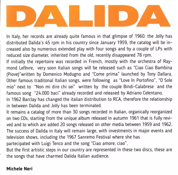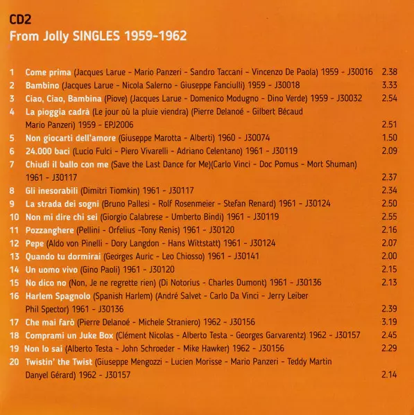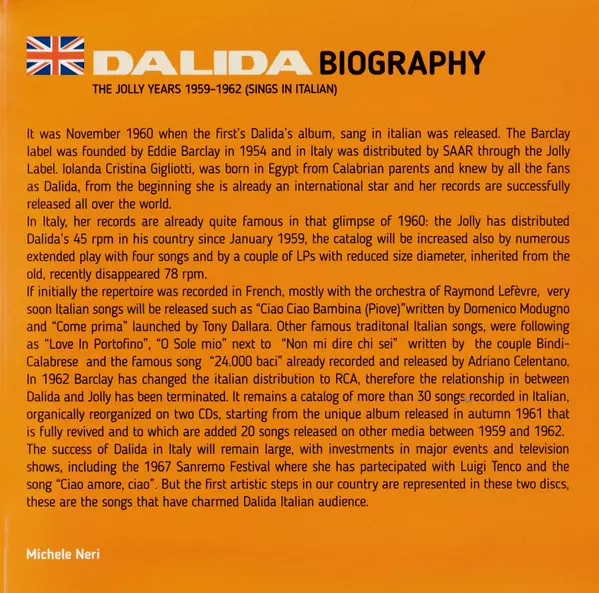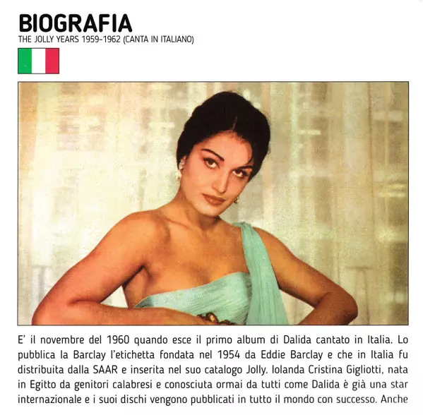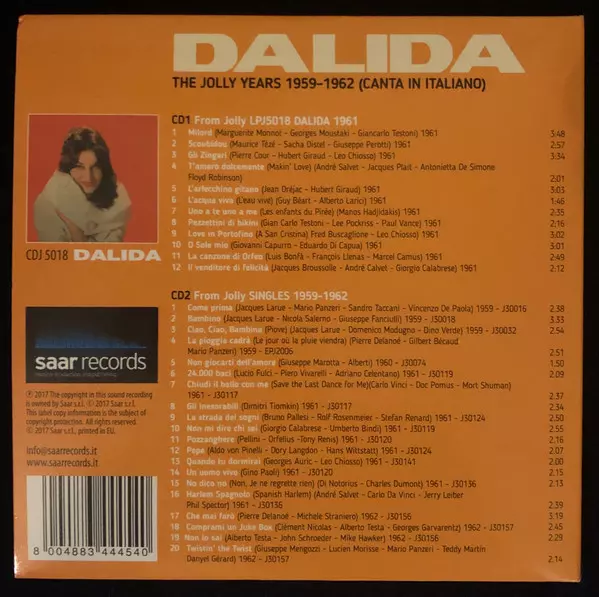 Dalida: The Jolly Years 1959/62 A lemezen lévő változat 2CD - standard kiadás. Ez a különleges kiadás - Olaszország a kiadó által Jolly a következőkkel együttműködve SAAR Records év 3. február 2017. Album műfajok között Pop, Ének, Ballada és Chanson.