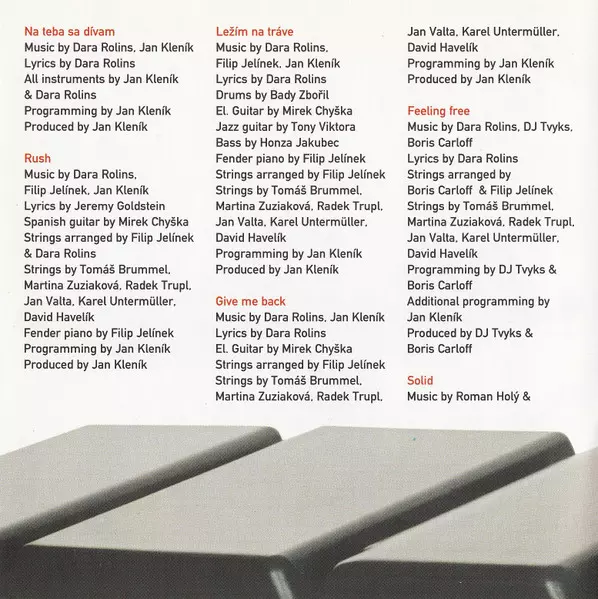 Arranged By [Strings] Filip Jelínek | Lyrics By Ricardo Carter | Music By Darina Rolincová, Jan Klenik | Producer, Electric Piano [Fender], Programmed By Jan Klenik | Strings David Havelík, Jan Valta (2), Karel Untermüller, Martina Zuziaková, Radek Trupl, Tomáš Brummel