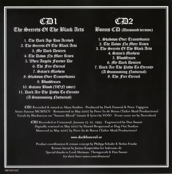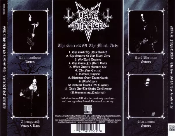 A "The Secrets Of The Black Arts" a svéd high-speed black metal királyok legendás debütáló albuma Dark Funeral és ez a verzió tartalmazza az 1995-ös alternatív Unisound mixet is.