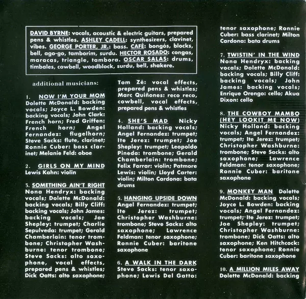 Arranged By Angel Fernandez, David Byrne | Backing Vocals Nicky Holland | Bass Clarinet Ronnie Cuber | Flugelhorn, Piano Angel Fernandez | Flute, Clarinet Steve Sacks | French Horn Fred Griffin, John Clark (2) | Oboe Melanie Feld | Tenor Trombone, Bass Trombone Chris Washburne | Trumpet Charlie Sepulveda | Written-By Angel Fernandez