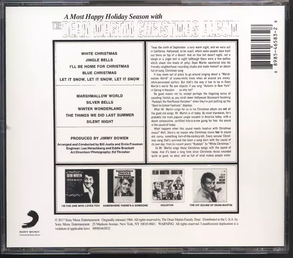 Dean Martin Az 1966-os karácsonyi album egy klasszikus ünnepi album. A lemezen a Dean Martin jellegzetes énekhangja, valamint a hagyományos és modern karácsonyi dalok keveréke hallható. Az album generációk óta a kedvencek közé tartozik, és biztos, hogy Önt is karácsonyi hangulatba hozza.