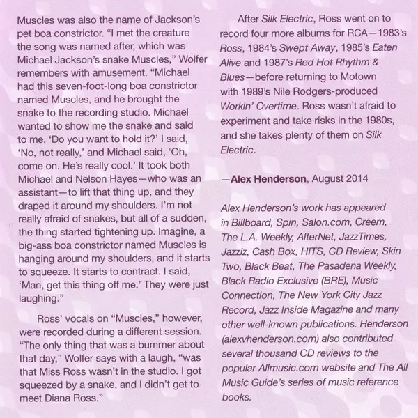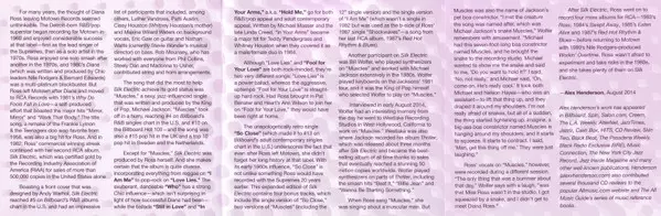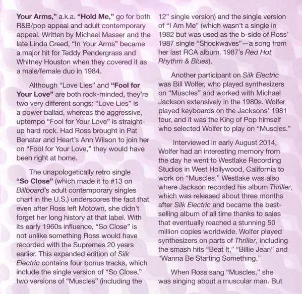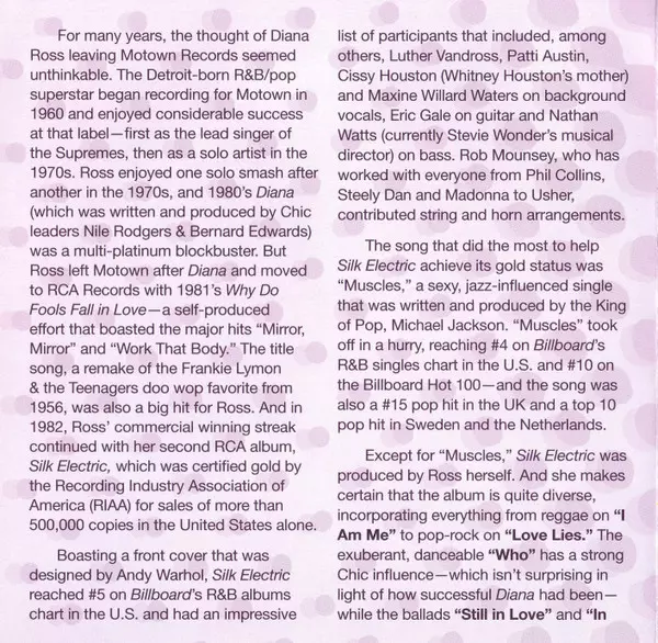 Diana Ross: Silk Electric A lemezen lévő változat CD - felújított kiadás. Ez a különleges kiadás - USA a kiadó által Funkytowngrooves a következőkkel együttműködve RCA és Sony Music Commercial Music Group év 8. március 2019. Album műfajok között Rock, Funk / Soul, Pop Rock és Soul.