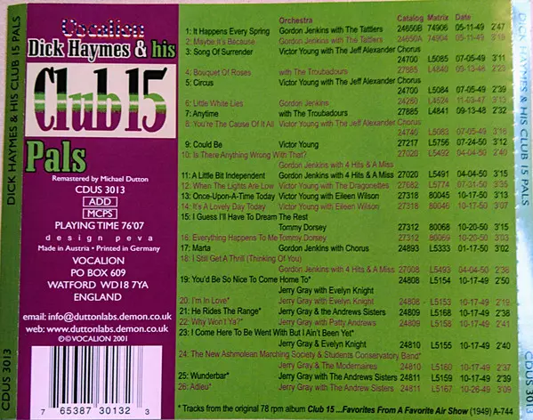 Dick Haymes: Dick Haymes & His Club 15 Pals A lemezen lévő változat CD - standard kiadás. Ez a különleges kiadás - UK a kiadó által Vocalion év 5. június 2001. Album műfajok között Pop, Jazz, Ének, Big Band és Swing.