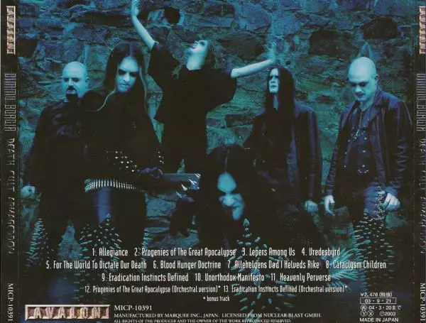 Death Cult Armageddon is the sixth studio album by Norwegian black metal band Dimmu Borgir, released in 2003. The album is widely regarded as one of the band's best albums and is praised for its dark, atmospheric sound. Death Cult Armageddon topped the Norwegian album charts and was successful in other countries as well, reaching the top ten in Germany and Sweden. The album's lead single, "Progenies of the Great Apocalypse", became a big hit and the music video for the song was nominated for a Grammy Award.