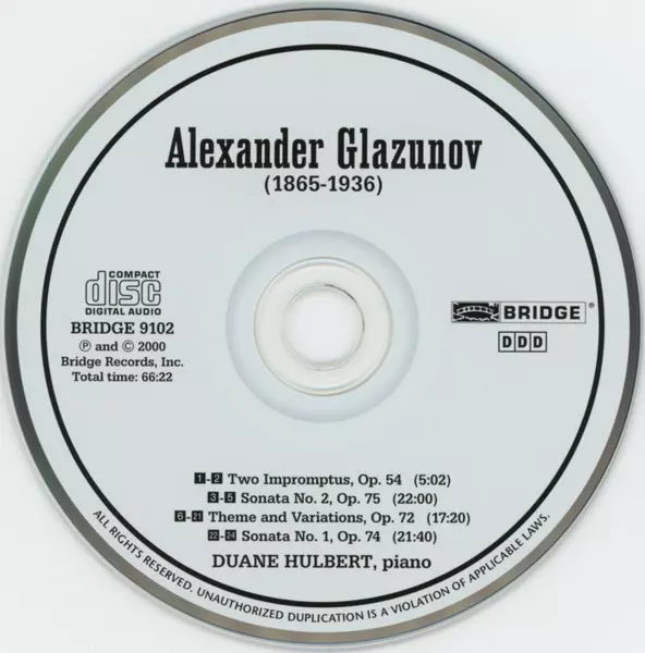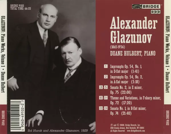 Duane Hulbert: Alexander Glazunov: Complete Piano Music Volume 1 A lemezen lévő változat CD - standard kiadás. Ez a különleges kiadás - USA a kiadó által Bridge Records (4) év 17. május 2001. Album műfajok között Klasszikus zene és Románcok.