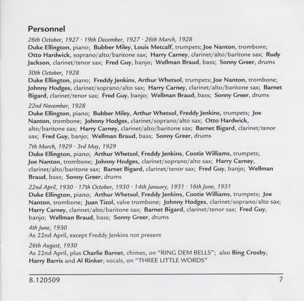 | Clarinet, Alto Saxophone, Baritone Saxophone Harry Carney | Clarinet, Soprano Saxophone, Alto Saxophone Johnny Hodges | Clarinet, Tenor Saxophone Barney Bigard | Trombone Joe Nanton | Trumpet Arthur Whetsel, Cootie Williams, Freddy Jenkins | Written-By Barney Bigard | |||
