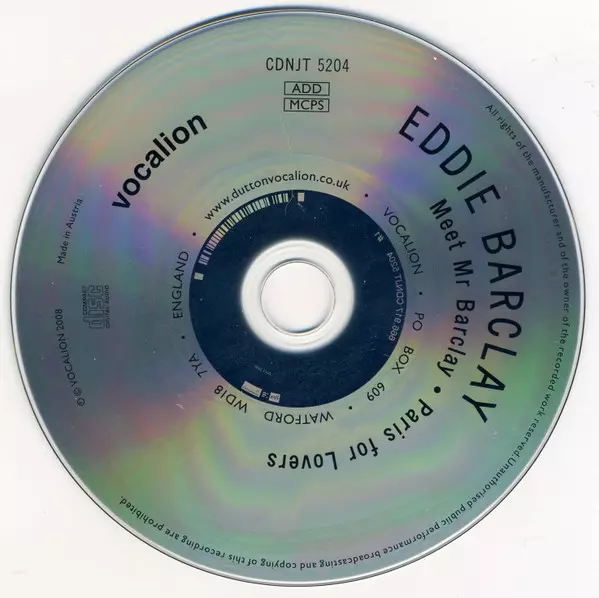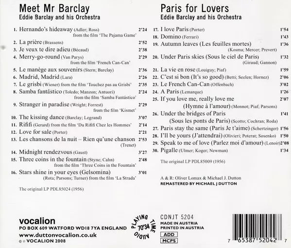 Eddie Barclay Et Son Orchestre: Meet Mr Barclay & Paris For Lovers A lemezen lévő változat CD - felújított kiadás. Ez a különleges kiadás - UK a kiadó által Vocalion év 19. szeptember 2008. Album műfajok között Pop, Színpad és képernyő, Folk, World, & Country, Latin zene, Könnyűzene, Cha-Cha és Samba.