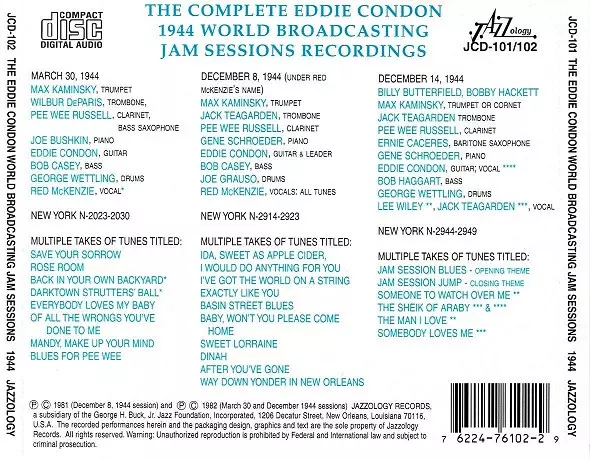 Eddie Condon: The Complete Eddie Condon 1944 World Broadcasting Jam Sessions Recordings A lemezen lévő változat 2CD - standard kiadás. Ez a különleges kiadás - USA a kiadó által Jazzology év 13. március 2014. Album műfajok között Jazz és Dixieland.