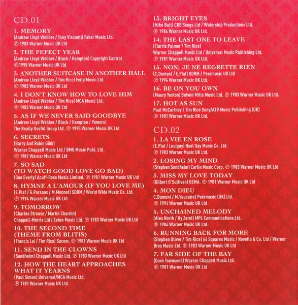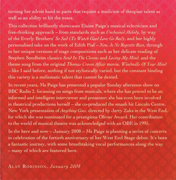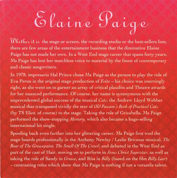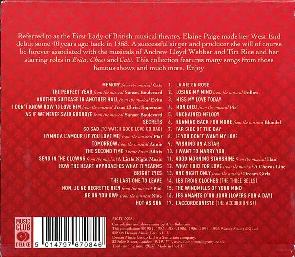Elaine Paige: Sweet Memories (The Essential Elaine Paige) A lemezen lévő változat 2CD - standard kiadás. Ez a különleges kiadás - UK a kiadó által Music Club Deluxe év 29. június 2006. Album műfajok között Színpad és képernyő és Musical.