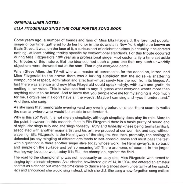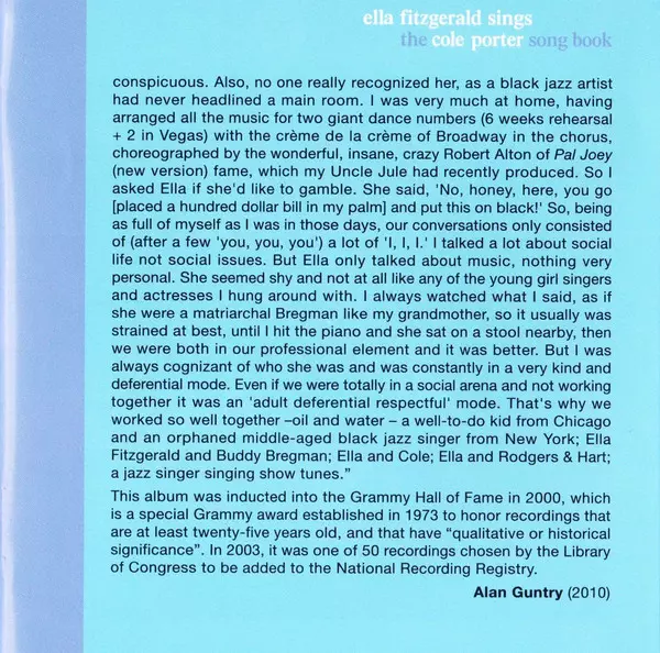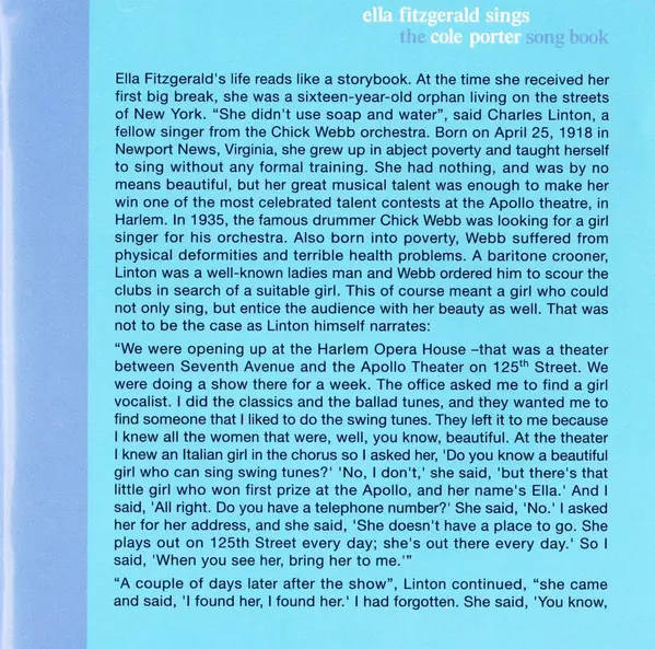 Itt a teljes klasszikus dupla album Ella Fitzgerald Sings The Cole Porter Song Book. A The Cole Porter Song Book, Ella első híres daloskönyve és minden idők egyik legjobb vokális jazzalbuma 2000-ben bekerült a Grammy Hall of Fame-be, amely a "minőségi vagy történelmi jelentőségű" felvételeket ismeri el. 2003-ban a washingtoni Kongresszusi Könyvt...