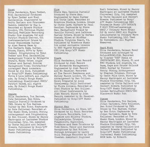 Arranged By [Strings] Larry Gold | Baritone Saxophone, Tenor Saxophone Sam Robles | Bass Trombone, Euphonium, Flugelhorn, Trombone, Trumpet Todd Simon | Engineer [Assistant] Karl Petersen (2) | Mixed By Manny Marroquin | Mixed By [Assisted By] Chris Galland, Delbert Bowers | Producer Shux | Recorded By [Strings] Jeff Chestek | Written-By Ella Henderson, Laura Pergolizzi, Shux
