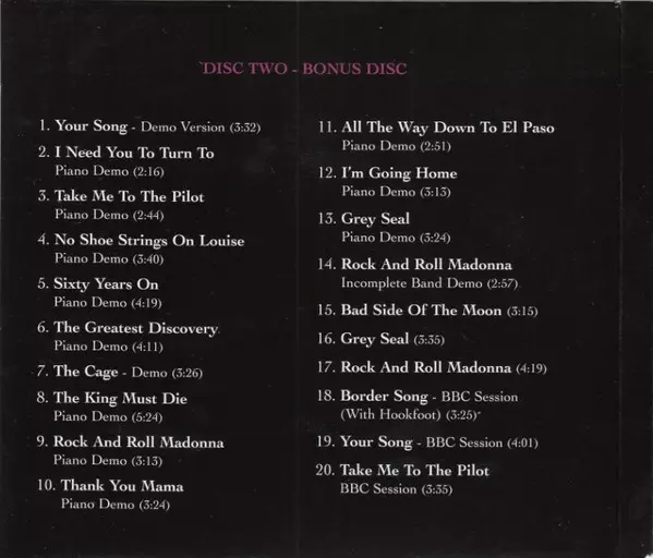 Limited deluxe remastered edition of the Elton John album with a bonus CD containing a total of 20 tracks, 15 of which have never been released before, and a twenty-eight page booklet. The now classic track Your Song also comes from this album.
