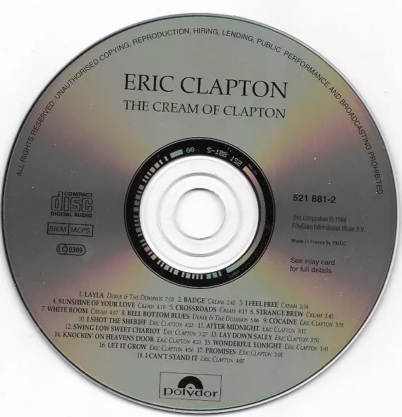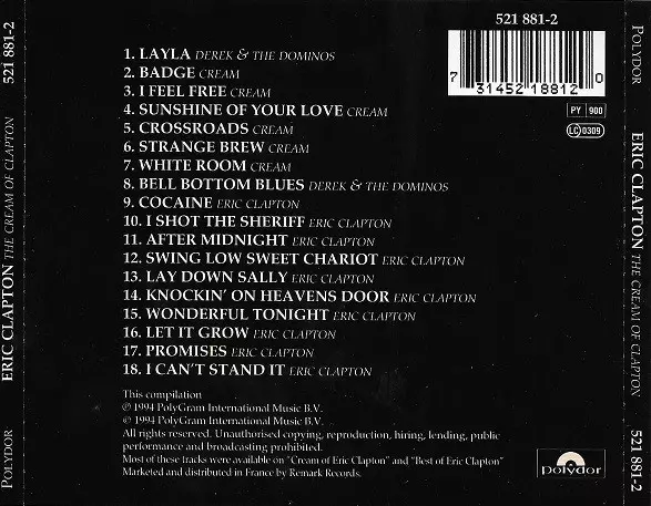 The Cream of Clapton is a compilation album released in 1994 on Eric Clapton. The album features some of Clapton's greatest hits from his time in Cream as well as several solo tracks. The album has been certified 3x platinum by the RIAA.