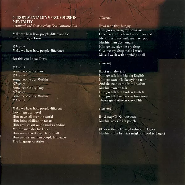| Baritone Saxophone Lekan Animashaun | Bass Guitar Franco Aboddy | Composed By Fela Kuti | Congas [1st Konga] Henry Koffi | Congas [2nd Konga] Daniel Koranteg | Congas [3rd Konga] Nicholas Addo | Drums Tony Allen | Maracas Isaac Olaleye | Percussion [Sticks] James Abayomi | Rhythm Guitar Segun Edo | Tenor Guitar Tutu Shoronmu | Tenor Saxophone Christopher Uwaifor | Tenor Saxophone, Alto Saxophone, Electric Piano, Vocals Fela Kuti | Trumpet [2nd] Ukem Stephen | Trumpet, Soloist [Trumpet] Tunde Williams | |||