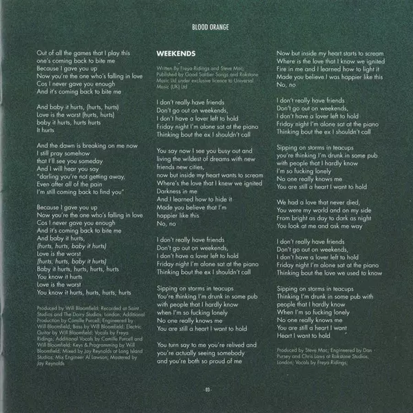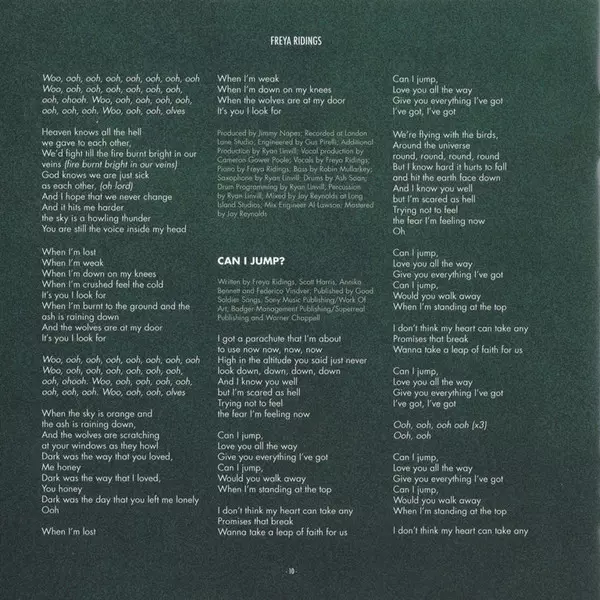 Cello, Backing Vocals, Bass Ewan Phillips | Engineer [Mix] Al Lawson | Engineer [Vocals], Producer [Vocals] Jack Gilbert (3) | Mastered By Ted Jansen | Mixed By Jay Reynolds | Producer Ewan Phillips, Jack Gilbert (3) | Vocals, Piano Freya Ridings | Written-By Freya Ridings, Mark Taylor, Paul Barry
