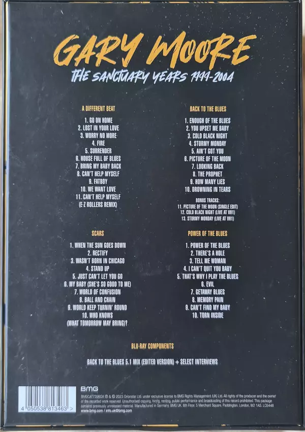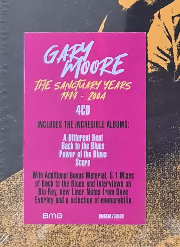 Gary Moore: The Sanctuary Years 1999-2004 DLX A lemezen lévő változat 4CD/Dobozkészlet/Blu-ray - deluxe kiadás. Ez a különleges kiadás a kiadó által BMG év 23. június 2023. Album műfajok között Rock, Blues és Blues-Rock.