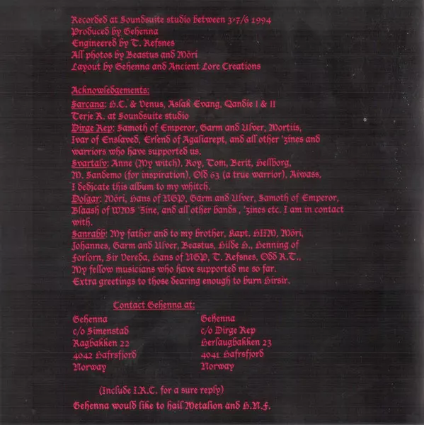 Gehenna egy norvég black metal együttes, amely 1993-ban alakult. Az együttes arról ismert, hogy a korai norvég black metal színtér része volt, amely mind a zenei stílusa, mind a számos fellépését övező viták miatt hírhedt lett. Gehenna's zenéje az idők során fejlődött, különböző mű...