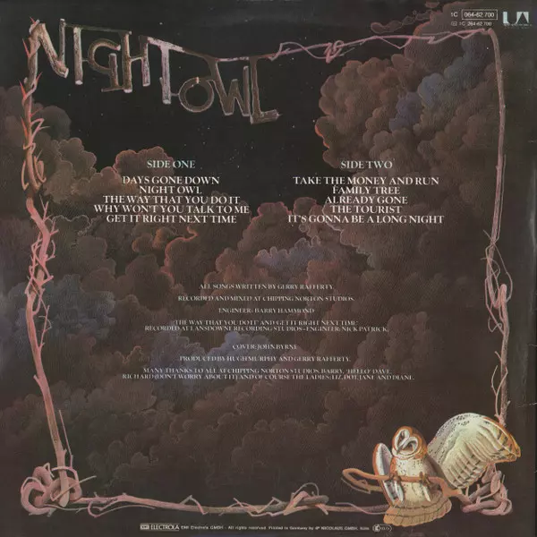 Gerry Rafferty: Night Owl A lemezen lévő változat bakelitlemez LP - standard kiadás. Ez a különleges kiadás - Németország a kiadó által United Artists Records a következőkkel együttműködve EMI Electrola napján jelent meg 1979. Album műfajok között Rock, Pop Rock és Soft Rock.