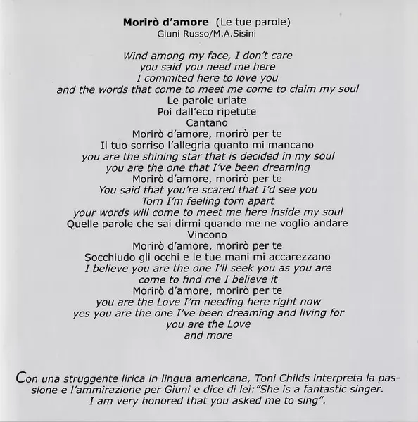 | CD-1 | Giuni Russo, Toni Childs: Morirò D'amore (Le Tue Parole) | 3:51 min | |